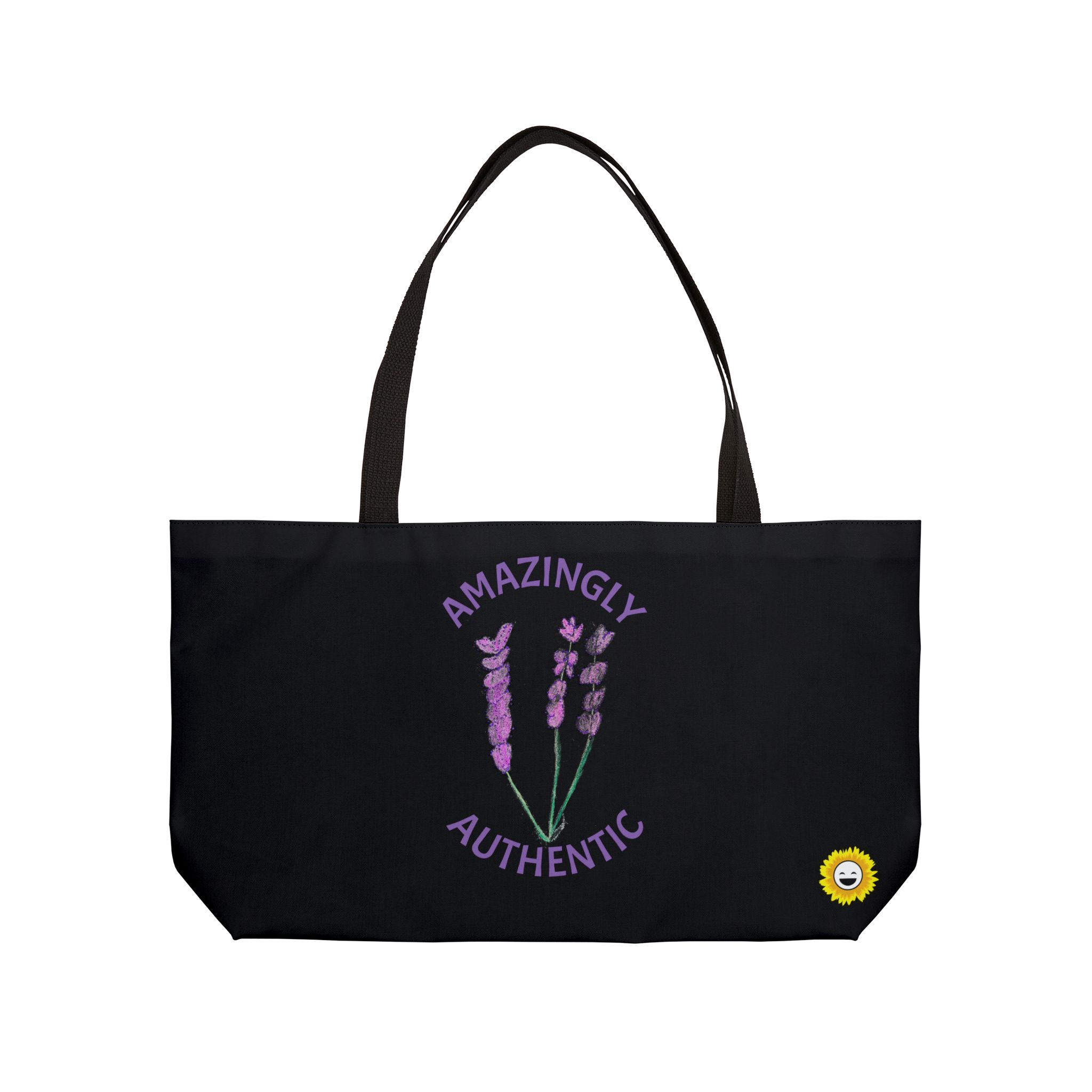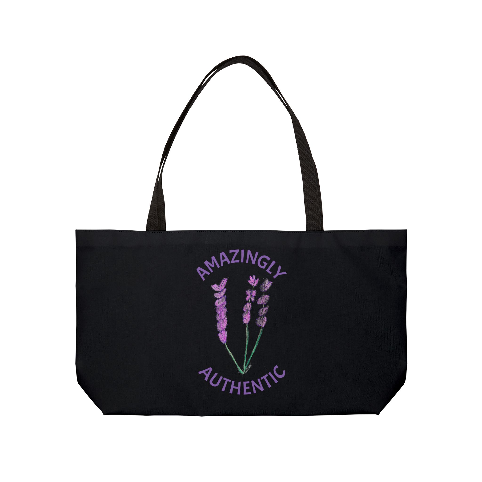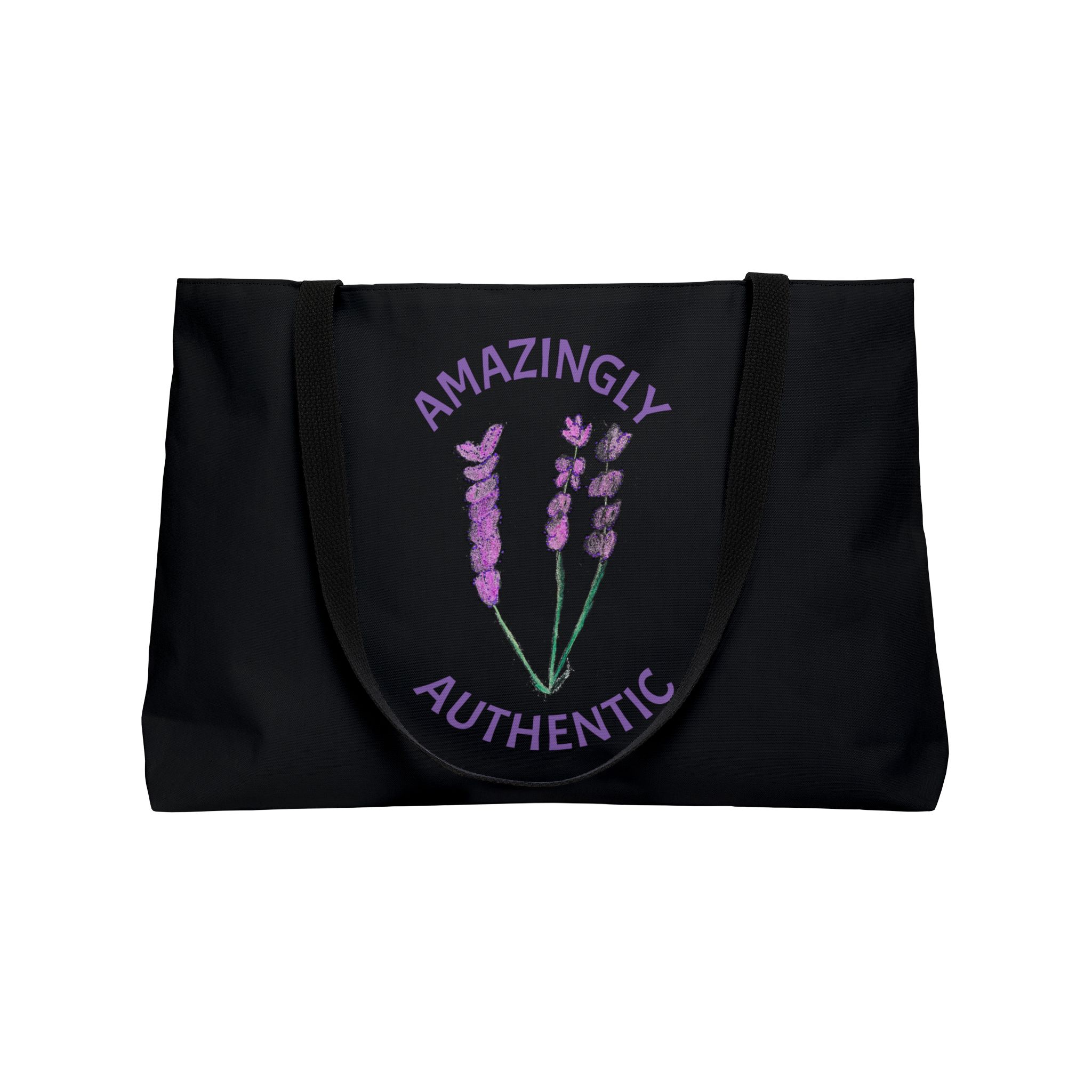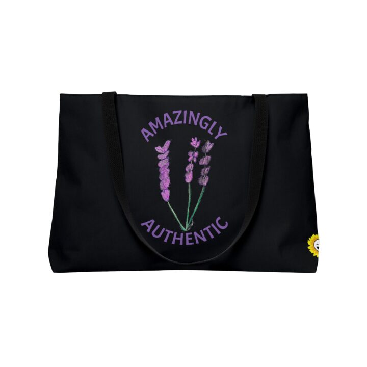 This personalized weekender bag comes in one size – 24″ x 13″ (60.9 cm x 33 cm) – perfect for those who love to travel light. Its t-bottom construction and black handles give it a sleek, classic look. Start designing, and we’ll print your art on the 100% spun polyester in vibrant colors. Quote: “Amazingly Authentic” Original artwork by Laughing Laura’s Designs.